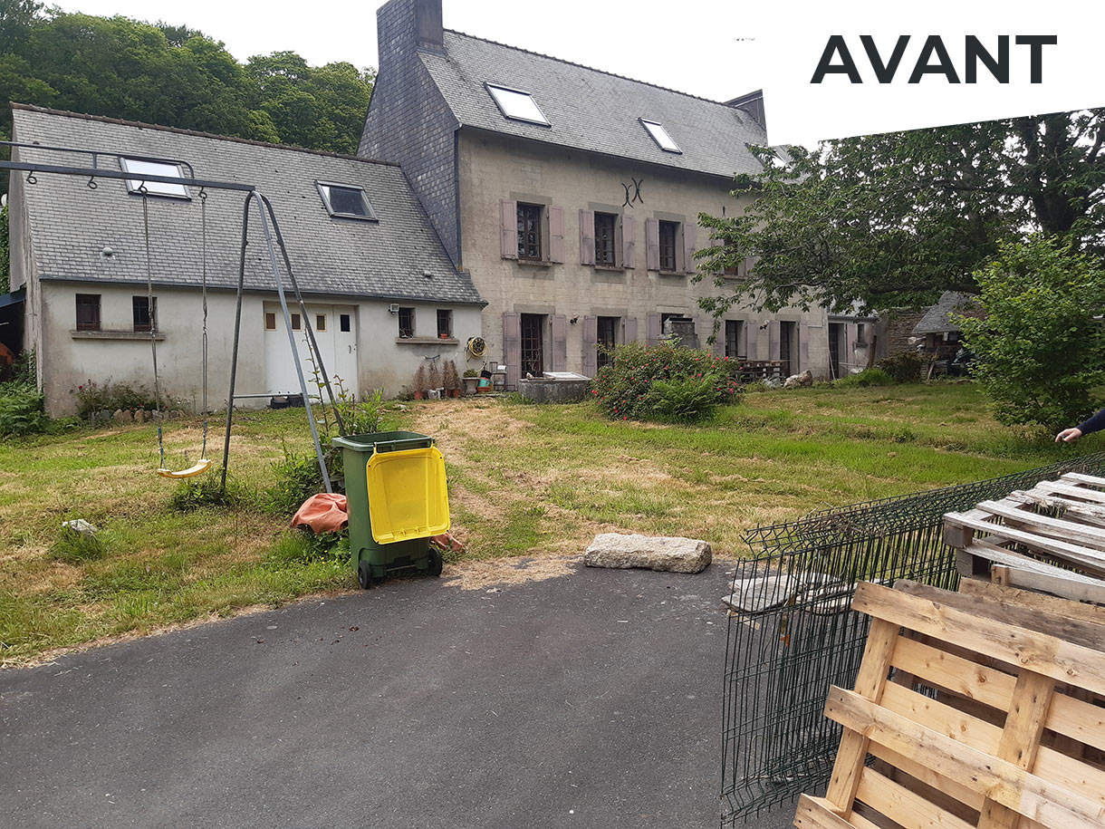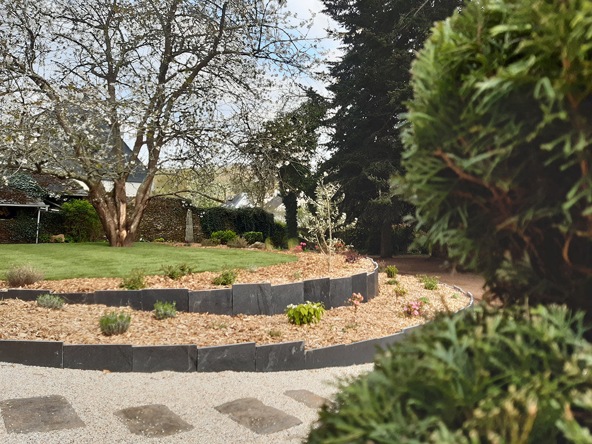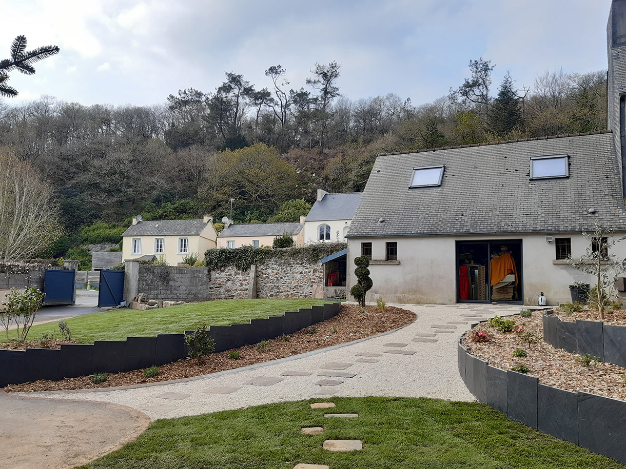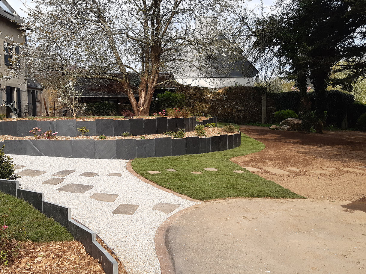 Aménagement de l’allée (avant/après), du gazon en placage, pose de pas japonais, aménagement de massifs avec copeaux de bois, palis ardoise
